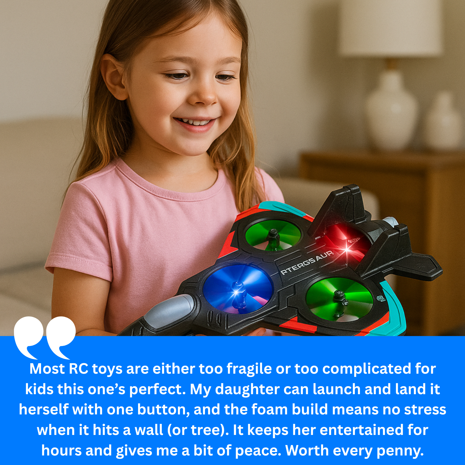 Absolutely. It’s lightweight and safe for indoor play, but powerful enough for smooth outdoor flights in calm weather.